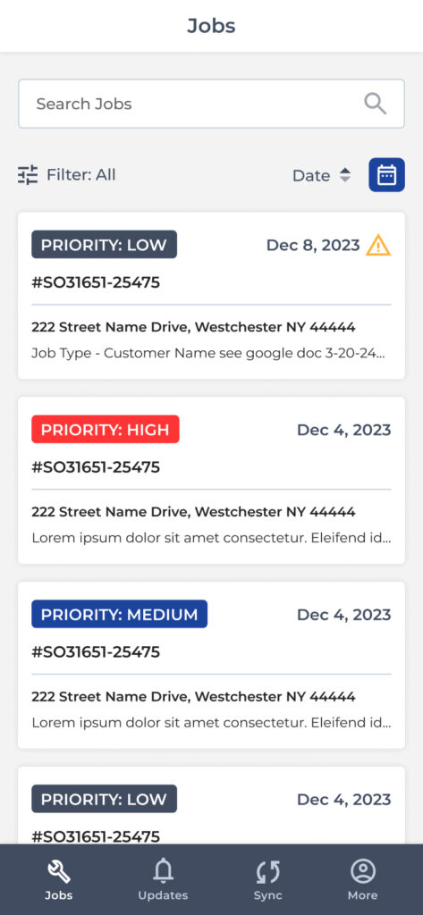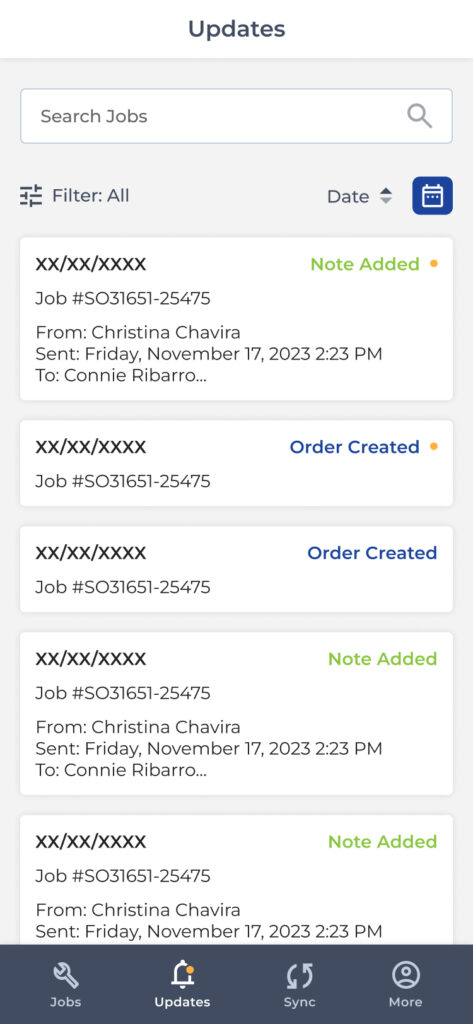 Field workers can view assigned jobs, including job details, status updates, and customer equipment information.